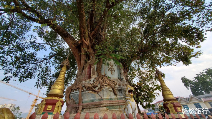 亚洲第一空腹佛塔-勐焕大金塔,珠围翠绕,在阳光的映照下闪闪,拍照超等出片。当夜幕驾临,华灯初上,另一侧的银塔与大金塔山鸣谷应,白净如玉的塔身,宁静而又鲜明。