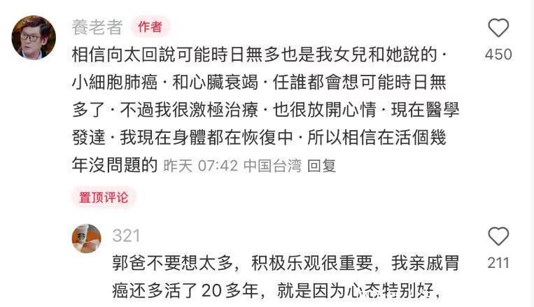 10月16日,郭爸爸晒出我方的病历,庄重复兴:我方如实确诊了小细胞肺癌,同期还有腹黑穷乏的问题。但他很安心,说这是男儿告诉向太的实情,不是外东谈主瞎猜。更让东谈主佩服的是,他仍是完成了42次放疗,大夫查验后说肿瘤仍是看不到了,规复得可以。