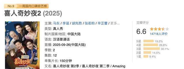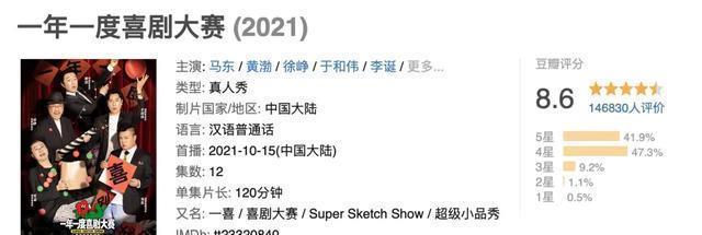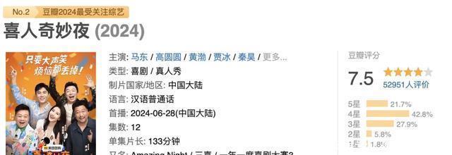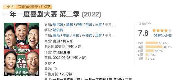 民间据说,这一季《喜东说念主奇妙夜》收尾后,马东一经不缱绻再举办。 莫得官方确凿修起。而从本季播出的后果来看,热度空前,影响力再次刷新,据说是微博综艺热播榜排行第一,抖音全年笑剧综艺排行第一,但亦然口碑断崖式下落,豆瓣评分上,从一年一度笑剧大赛1的8.6分葡萄京娱乐网站娱乐网,一年评分比一年低,下落到本年的6.6分。