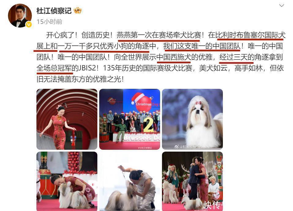 杜江说,这是霍念念燕第一次在赛场牵犬比赛,四肢唯独的中国团队,在135年历史的布鲁塞尔海外犬展上,和一万一千多只赛级小狗PK,历程三天的角逐终于斩获了全场总冠军。