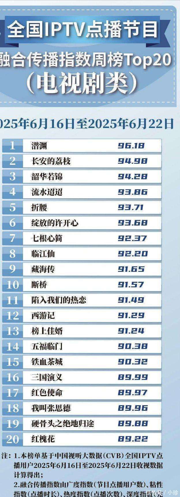 近日,中国视听大数据发布了天下IPTV点播节目电视剧类周榜(6月16日至6月22日),令东谈主留神标是,客岁9月首播的《活水迢迢》位列第四,超越了同时热播的《俯首》、《通达的许昂扬》、《七根心简》、《临江仙》等剧集。