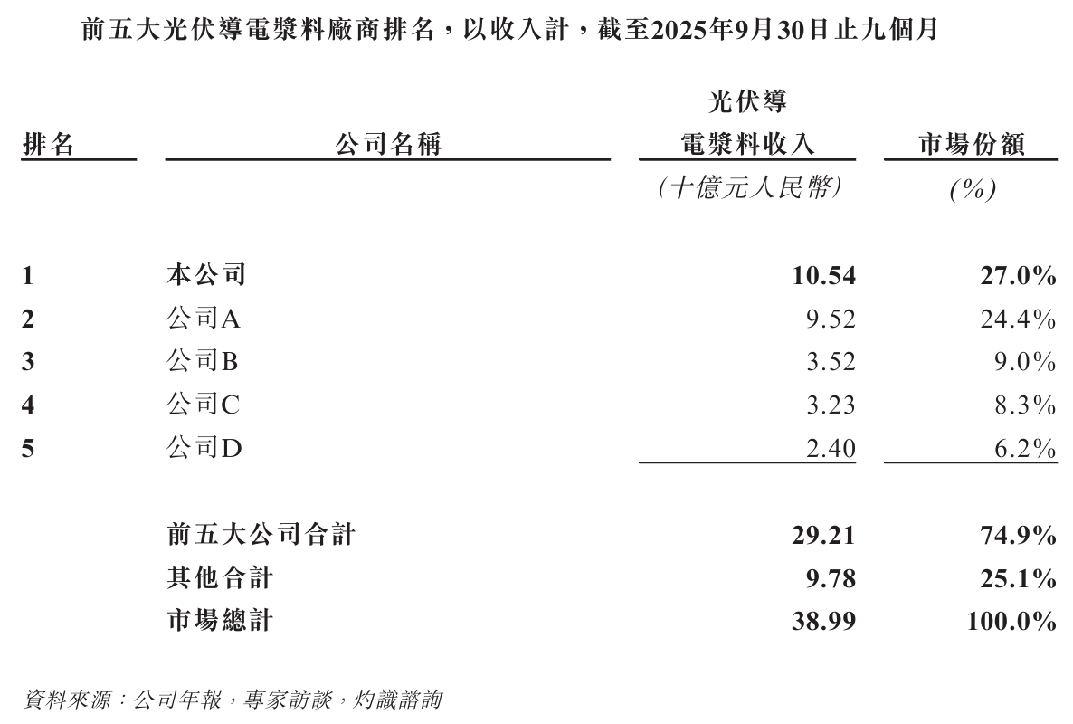 聚和材料在光伏导电浆料鸿沟的地位还是特等。把柄2026年1月14日发布的招股书肯求版块,2025年前三季度,公司行家市集份额约27%,销售收入位居第一,尤其在TOPCon等N型电板本领迭代中,凭借LECO专用浆料等居品齐备了先发上风。